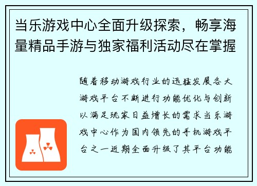 随着移动游戏行业的迅猛发展,各大游戏平台不断进行功能优化与创新,以满足玩家日益增长的需求。当乐游戏中心作为国内领先的手机游戏平台之一,近期全面升级了其平台功能,为用户带来了更加丰富多彩的游戏体验。从海量精品手游的推荐到独家福利活动的推出,每一项升级都旨在为玩家提供更加流畅、便捷和多元化的使用体验。本文将从四个方面详细探讨当乐游戏中心的全面升级,阐述其在手游推荐、用户体验、福利活动及社区互动等方面的创新与变化,帮助玩家更好地了解这一平台的独特魅力。